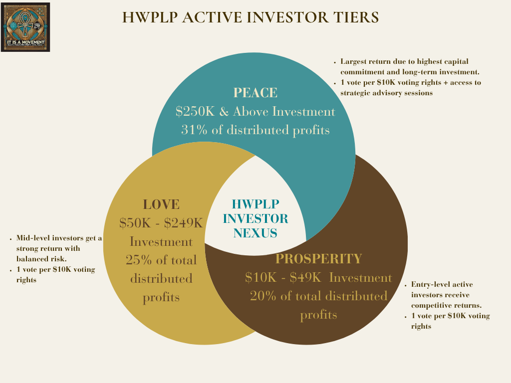 Passive Investors (similar to a REIT) contribute monthly and receive quarterly profit-sharing distributions based on their contribution tier. While Passive Investors do not have voting rights, they are vital to fueling the growth of HWPLP’s impact.